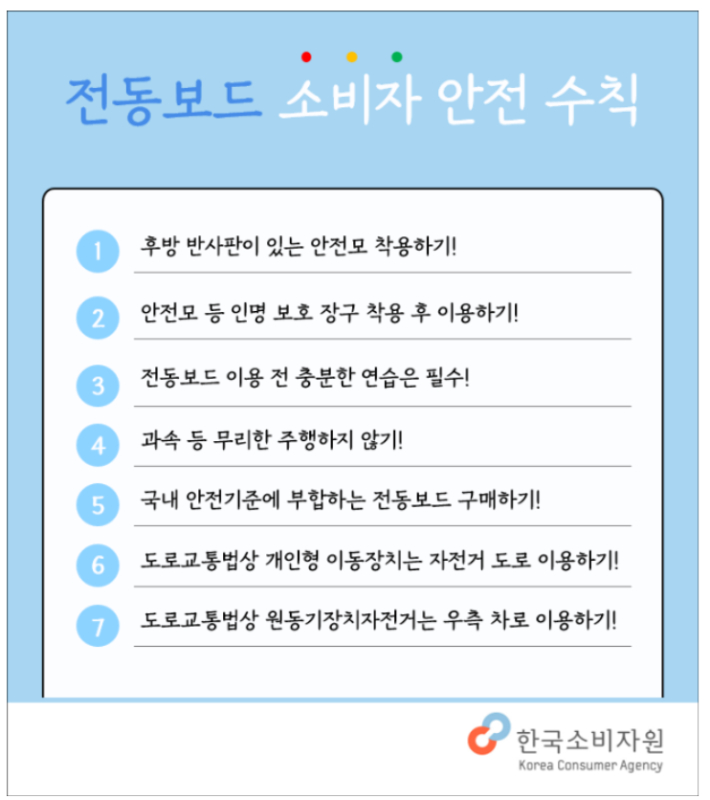소비자원 관계자는 "소비자들은 안전을 위해 전동보드를 구매할 때 안전관리기준에 적합한 제품을 선택해야 한다"며 "안전을 위해 반드시 후방 반사판이 있는 안전모를 착용하고 최대속도 이하로 주행해 달라"고 당부했다.