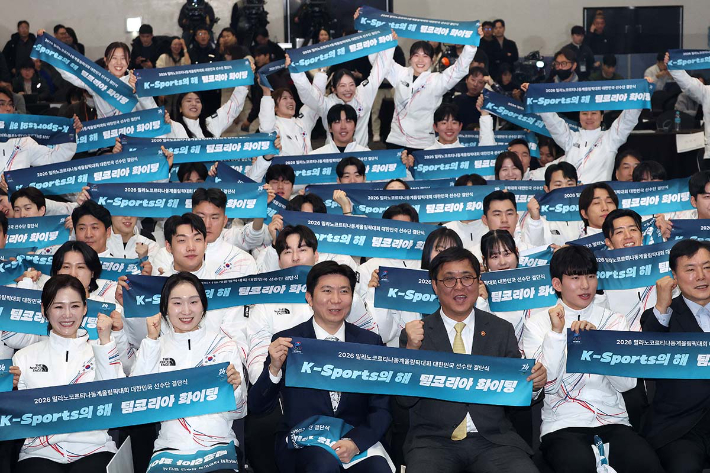 최휘영 문화체육관광부 장관, 유승민 대한체육회장, 이수경 선수단장, 쇼트트랙 최민정, 스피드스케이팅 정재원 등 출전 선수들이 22일 서울 송파구 올림픽파크텔에서 열린 2026 밀라노코르티나 동계올림픽대회 결단식에서 기념촬영을 하고 있다.