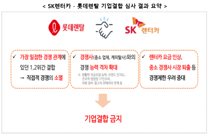 공정위는 롯데렌탈과 SK렌터카에 대한 기업결합 심사 결과 금지 결정을 내렸다고 26일 밝혔다.