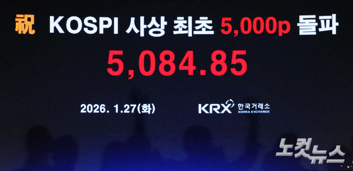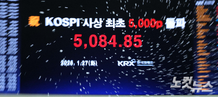 27일 서울 여의도 한국거래소 전광판에 코스피 지수 5084.85가 표시되고 있다.