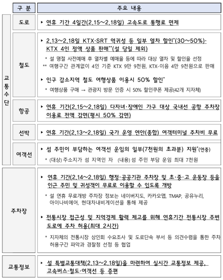 재정경제부 제공각종 교통・휴양시설 이용료도 면제된다. 연휴 기간 고속도로 통행료(2월 15~18일)가 면제되고 KTX·SRT 역귀성 등 일부 열차에 대해 30~50% 할인(2월 13~18일)이 제공된다.
