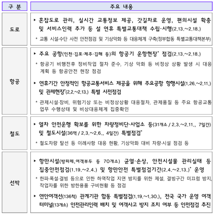재경부 관계자는 "교통안전이나 응급의료, 도로·항공·철도·선박 관련 점검 등 24시간 상황 관리·대응 체계를 운영하겠다"며 "문 여는 병원·약국 정보를 포털 등에 제대로 공급해 국민들이 잘 활용할 수 있도록 하겠다"고 말했다.