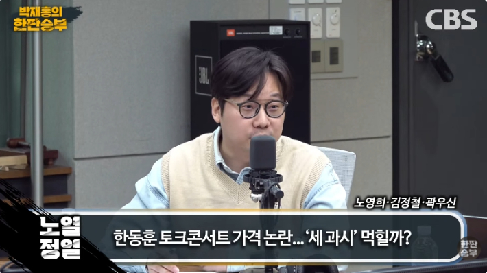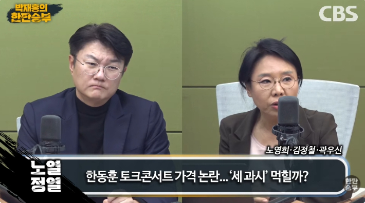 ◆ 노영희> 기획사가 가져가도 되나요? 그러면은? 왜냐하면 지금 이 콘서트는 한동훈을 지지하는 사람들을 위해 만든 거잖아요. 그러면은 그 기획사 배불러 주려고 사실은 콘서트를 하는 게 아닐 거잖아요. 근데 R석을 7만 9천원이나 받고 S석은 3만 얼마 받는다는데 다 합치게 되면 되게 돈이 많대요, 이게 금액이.