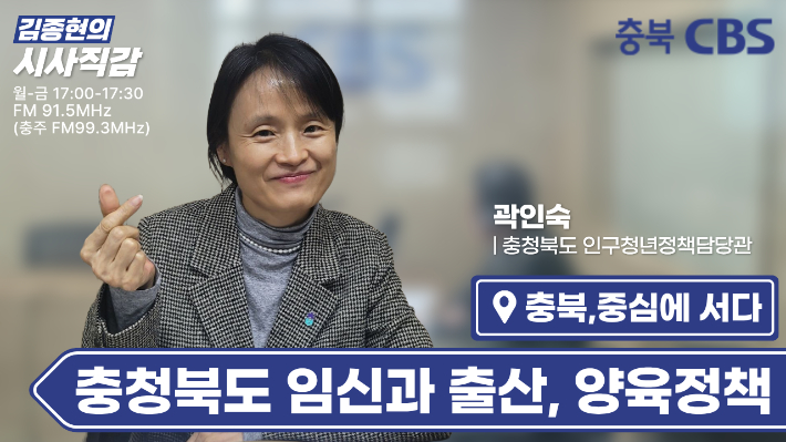 ◇ 김종현> <시사직감>은 매주 화요일 이 시간 <충북, 중심에 서다> 코너로 여러분 만나고 있습니다. 충청북도의 다양한 현안과 충청북도가 추진하는 여러 정책을 각 실국의 담당자들이 직접 출연해 소개하는 시간입니다. 오늘은 곽인숙 충청북도 인구 청년정책담당관에게서 충북에 임신과 출산, 양육 정책에 대해 자세히 들어봤습니다.