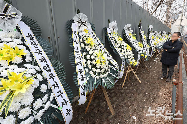 5일 서울 용산구 한강로3가 인근 용산국제업무지구 공사장 펜스에 정부의 주택 공급대책에 항의하는 근조화환이 놓여 있다.