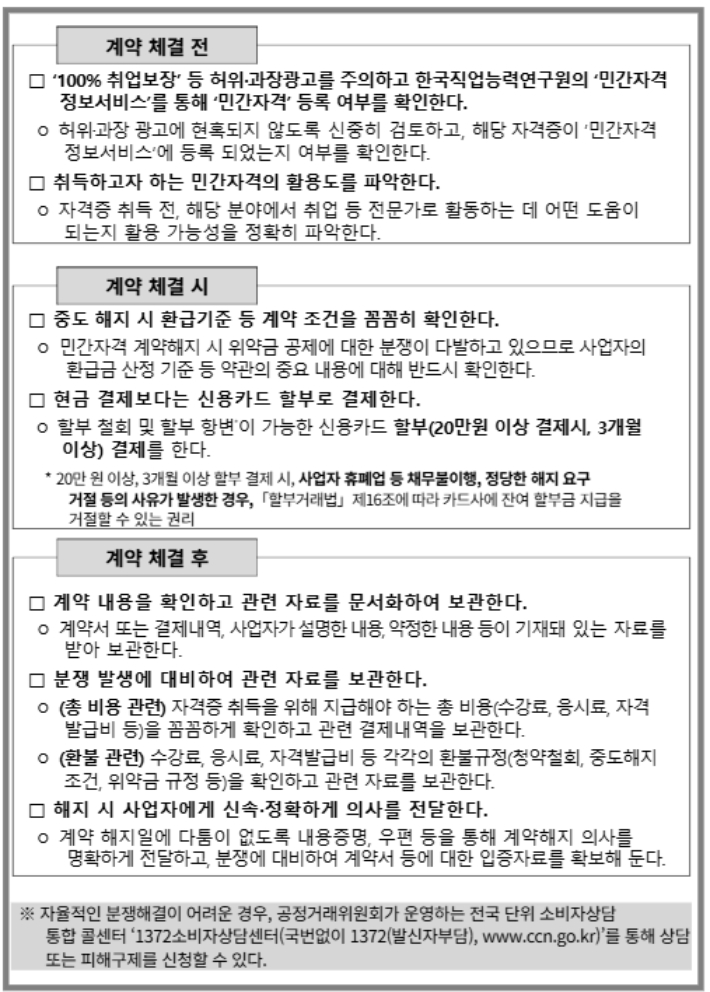 소비자원 관계자는 "과장된 광고 문구에 현혹되지 않아야 하며 자격의 법적 성격(공인 여부) 및 취소·환불 기준, 총비용 등을 계약 전에 반드시 확인해 달라"고 말했다.