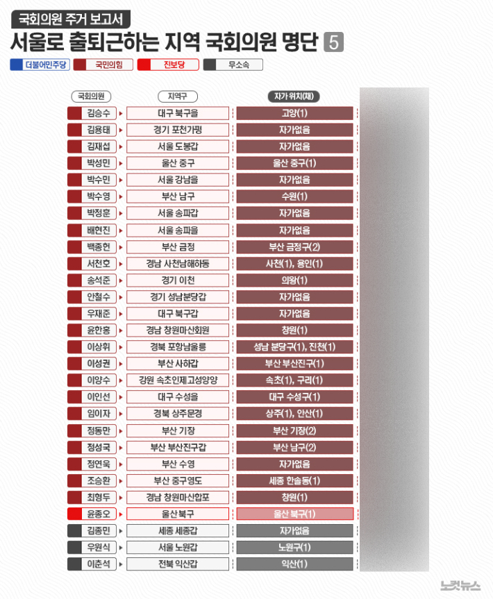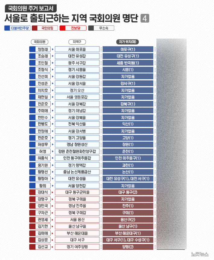 한편 국민의힘 조지연 의원(경북 경산)과 민주당 이개호 의원(전남 담양·함평·영광·장성군)은 본인 지역구가 아닌 지역에 주택을 보유하고 있었다. 국민의힘 주진우 의원(부산 해운대갑)은 자가 주택 없이 서울 강남구 압구정동 아파트를 전세로 임차해 살고 있다.