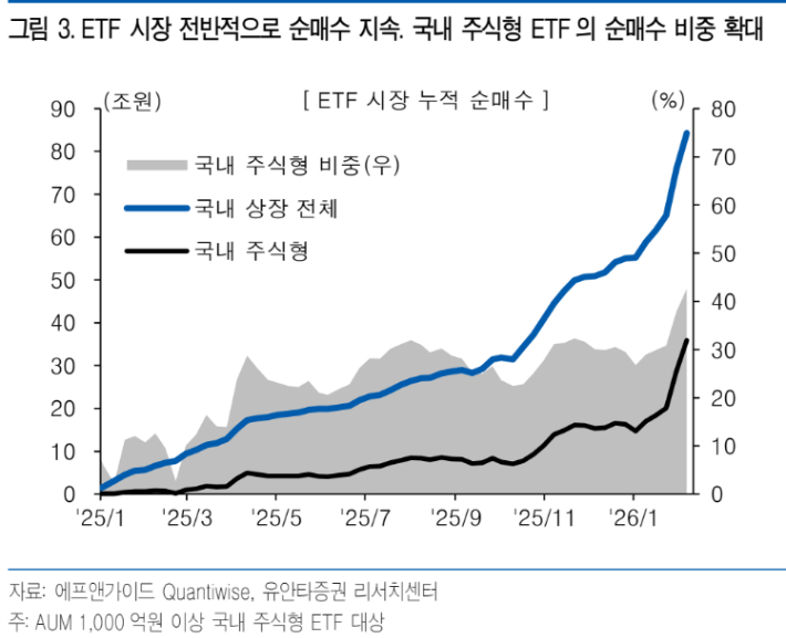 신현용 유안타증권 연구원은 "국내 상장 ETF로의 순매수가 지속되면서 ETF 수급은 현재 증시의 주요 순매수 주체로 역할하고 있다"며 "ETF를 통해 유입된 자금은 더 이상 시장의 보조적 수단이 아니라 주요 수급 주체로서 기능하고 있다"고 분석했다.
