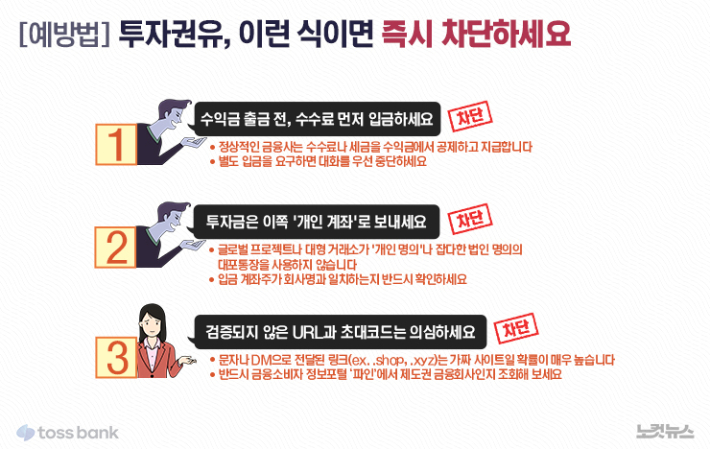 토스뱅크 금융사기대응팀 관계자는 "AI 기술, 가상화폐 등 키워드를 미끼로 사용하지만 본질은 모두 동일하다"며 "화면 속 수익률이 아무리 높아도, 입금하려는 계좌가 해당 거래소의 공식 법인 계좌가 아닌 개인 명의이거나 매번 다른 이름의 계좌를 알려준다면 사기를 의심해야 한다"고 밝혔다. 그러면서 "정상적인 금융 투자는 절대 개인 계좌로 투자금을 받지 않는다"고 강력히 경고했다.