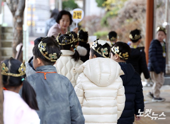 3일 서울 서초구 원촌초등학교에서 입학식을 마친 신입생들이 담임선생님을 따라 교실로 향하고 있다.