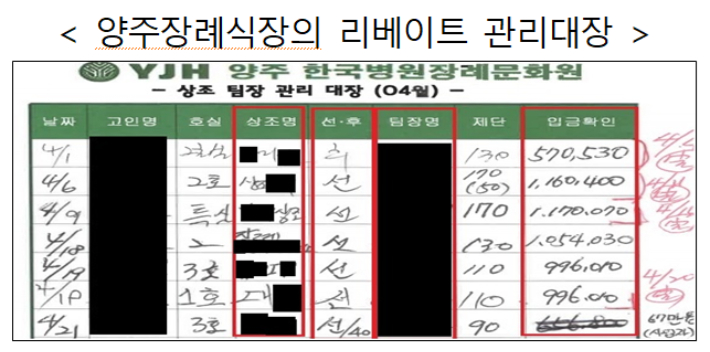 양주장례식장은 2021년 11월부터 2025년 8월까지 112개 상조업체의 장례지도사들에게 이른바 '콜비'와 '제단꽃R' 명목으로 3억 4천만 원 상당의 리베이트를 제공한 것으로 조사됐다.