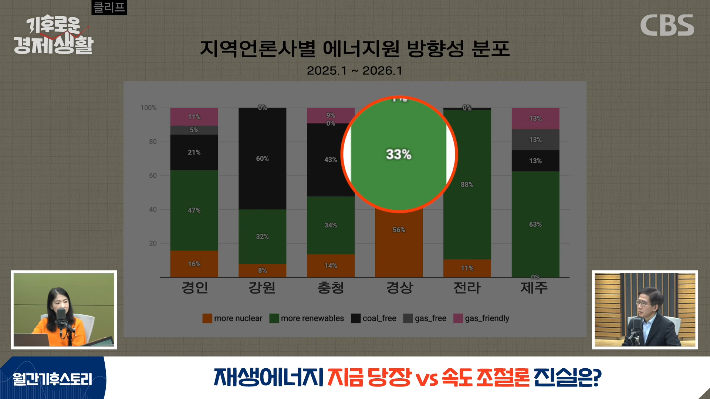 ◇ 윤지로> 네, 지역별로도 봤는데요. 호남의 비율이 굉장히 높았습니다. 호남 지역 언론에서는 88%의 비율로 재생에너지를 강조하는 사설이 많았는데, 예를 들면 영농형 태양광 특별법이 빨리 통과돼서 농업인 소득 향상에 기여해야 된다, 새만금이나 해남 솔라시도가 재생에너지 실현의 최적 장소다, 등등의 이야기가 많았고요. 또 하나 흥미로웠던 게, 지역 언론 중에서 재생에너지 지지 목소리가 가장 낮은 곳이 경상권이긴 했습니다. 그런데 가장 낮다고 해도 33%가 신재생에너지 목소리를 냈어요.