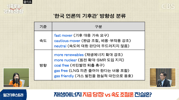 ◆ 홍종호> 기후위기 심층 취재 미디어 클리프 윤지로 대표와 함께하고 있습니다. 앞선 시간에 언론의 성향, 소위 진보냐 보수냐에 따라서 원전·재생에너지에 대한 논조와 보도량, 강조점이 달라진다는 이야기를 해봤는데요. 좀 더 깊게 이야기를 해보도록 하겠어요. 직접 분석하신 내용이 있다고요?