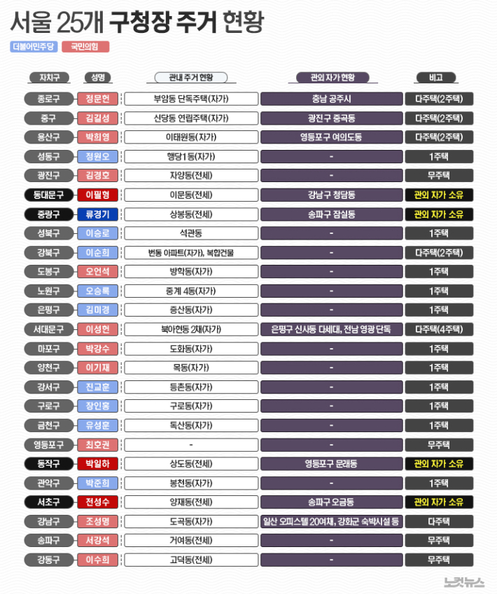 25명 모두 관내에 실거주하고 있었는데, 이필형 동대문구청장∙박일하 동작구청장∙전성수 서초구청장(국민의힘)과 류경기 중랑구청장(더불어민주당)은 관외 자가주택을 보유하면서 정작 관내 거처는 임차주택으로 해결하고 있었다.