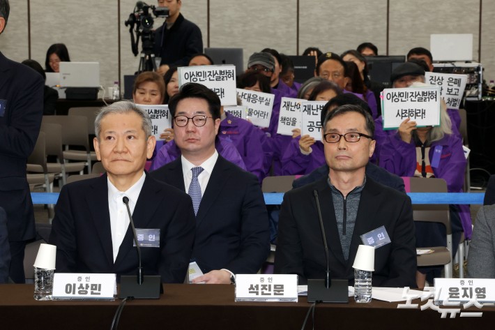 이상민 전 행정안전부 장관이 12일 오후 서울 중구 은행회관에서 열린 10·29이태원참사 진상규명 청문회에 증인으로 참석한 가운데 유가족들이 손팻말을 들고 방청하고 있다.