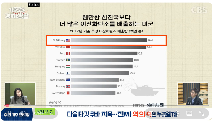 웬만한 국가 못지않게 탄소 배출을 많이 하는 걸로 알려져 있어요. 미 국방부가 그 자체로요. 그래서 미국 브라운대 왓슨 연구소가 2019년에 '전쟁 프로젝트의 비용'이란 보고서를 내서 이런 내용을 고발한 적이 있었어요. 아직 미군이 아프가니스탄에서 철군하기 전, 전쟁 중이었죠.