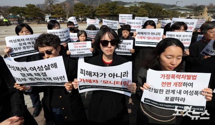 17일 서울 종로구 청와대 분수대 앞에서 '남양주 가정폭력·스토킹 여성살해사건 긴급대응 기자회견' 참석자들이 손피켓을 들고 있다.
