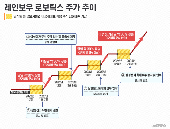 검찰은 이들이 지난 2022년에서 2024년까지 삼성전자가 레인보우로보틱스에 잇따라 지분을 확보하고 최종 인수하는 과정에서 호재성 미공개 정보를 이용해 주식을 매수해 총 30~40억 원대 부당이득을 얻었다고 의심하고 있다.