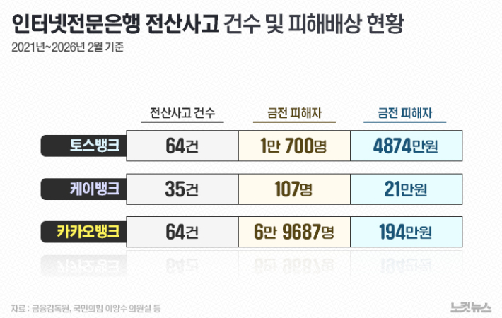 이중 토스뱅크의 전산사고가 64건이었다. 실제 금전 피해자는 1만 700명, 배상 금액은 4874만원으로 3사 가운데 최대 규모다. 지난 10일 '엔화 반값 환율 오류' 사고는 반영되지 않았다.
