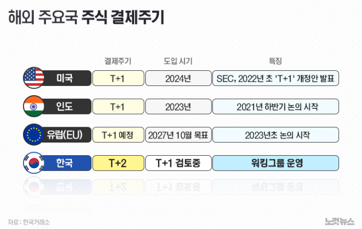 아시아 주요 선진국 중에선 현재 T+1 거래일 시행을 확정하거나 목표를 발표한 나라는 없다. 한국이 가장 선제적으로 준비 중이다. 하지만 아직 준비 상황은 극초기 단계다. 한국거래소도 지난해 10월 한국예탁결제원과 주식 매매 체결 이후 청산·결제가 완료되는 데 걸리는 시간'을 줄이는 방안을 논의하는 실무그룹을 구성했다. 거래소 관계자는 "어떤 절차에 착수한 게 아니라, 논의를 위한 초초기 그룹"이라고 설명했다.