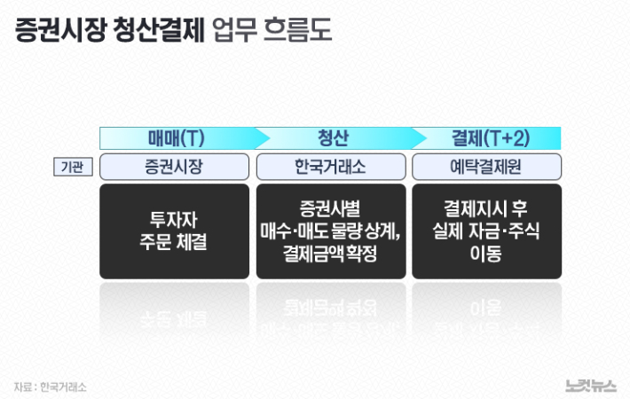 현재 국내 증시는 주식 거래 뒤 2영업일 뒤 결제가 T+2 시스템으로 운영되고 있다. 예를 들어 월요일에 주식을 팔기로 매도 계약을 체결했으면, 실제 주식과 대금의 교환은 수요일날 이뤄진다. 대량의 주식과 돈이 오가는만큼 거래소가 증권사 간 거래를 정산·정리(청산)하고 이를 바탕으로 예탁결제원이 결제하는 시간이 필요하기 때문이다.