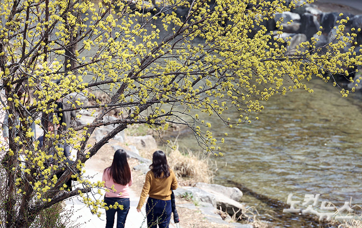 서울 낮 최고기온이 19도까지 오르며 완연한 봄 날씨를 보인 23일 서울 종로구 청계천을 찾은 시민들이 산책을 하고 있다. 이날 기상청은 이달 말일까지 아침 기온은 영하 2도~영상 10도, 낮 기온은 영상 12~21도를 오르내리겠으며 이번 주 제주를 제외하고는 비 소식이 없을 것으로 예보했다.