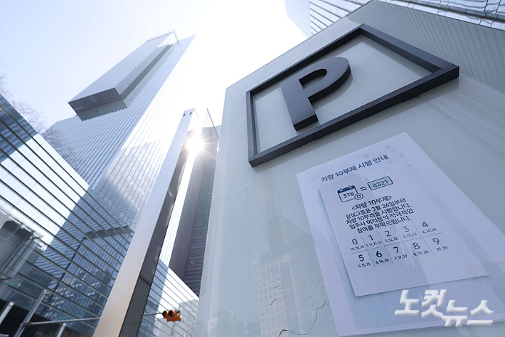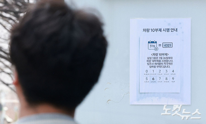 26일 서울 삼성생명보험 서초사옥 주차장 입구에 차량 10부제 시행 안내문이 붙어 있다.