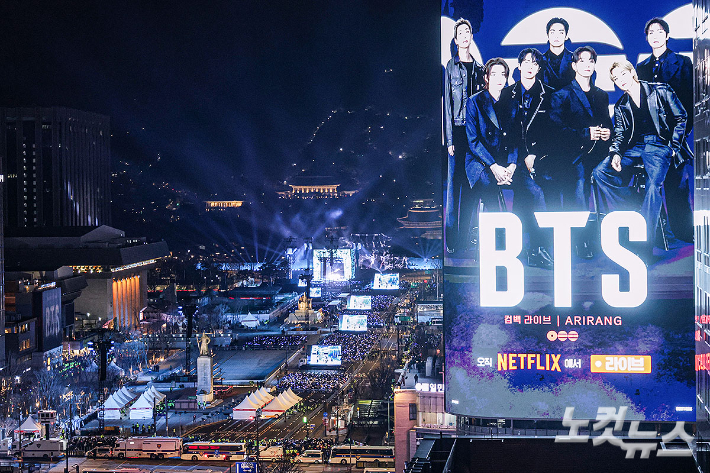 그룹 방탄소년단(BTS)이 21일 서울 광화문 광장에서 복귀 공연 'BTS 컴백 라이브: 아리랑'(BTS THE COMEBACK LIVE | ARIRANG)'을 펼치고 있다. 3년 9개월 만에 나온 정규 5집 '아리랑'(ARIRANG) 발매 기념행사로, 광화문 광장에서 1시간가량 단독 콘서트를 해 전 세계로 생중계한 것은 이번이 처음이다. 사진공동취재단