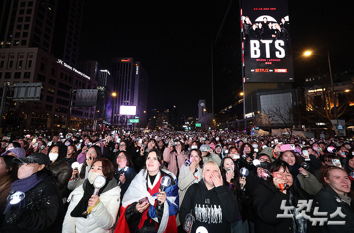 21일 서울 광화문역 사거리 일대에서 방탄소년단(BTS) 팬들이 정규 5집 '아리랑(ARIRANG)' 앨범 발매를 기념해 열린 컴백 공연을 즐기고 있다. 이날 서울시와 경찰 등은 광화문 일대에 4만 명 넘게 인파가 몰린 것으로 추산했다. 애초 예상됐던 26만 명보단 크게 못 미쳤지만, 그래도 광화문 일대는 발 디딜 틈 없는 인파로 종일 북적였다. 황진환 기자