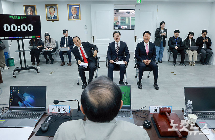 6·3 지방선거 서울시장에 도전하는 국민의힘 예비후보들이 22일 서울 영등포구 여의도 국민의힘 중앙당사에서 열린 광역단체장 후보 면접에 참석해 시작을 기다리고 있다. 오른쪽부터 오세훈 서울시장, 국민의힘 박수민 의원, 김충환 전 강동구청장. 황진환 기자