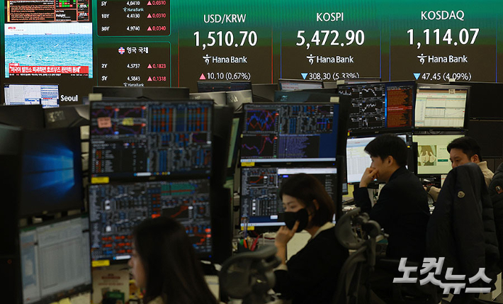 미국·이스라엘과 이란 전쟁 확전 공포에 원·달러 환율이 17년여 만에 1510원대를 돌파하고 코스피는 매도 사이드카 발동 이후에도 6%대 급락세를 보이고 있는 가운데 23일 오전 서울 중구 하나은행 딜링룸에 코스피와 환율이 표시돼 있다. 류영주 기자