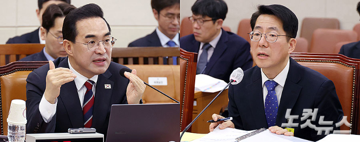 박홍근 기획예산처 장관 후보자(왼쪽), 황종우 해양수산부 장관 후보자가 23일 국회에서 열린 인사청문회에 출석해 질의에 답변을 하고 있다. 윤창원 기자