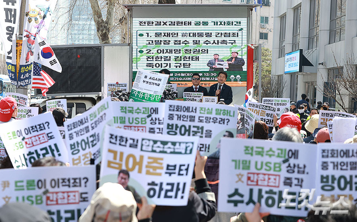 한국사 강사 출신 유튜버 전한길 씨와 김현태 전 특수전사령부 707특수임무단장이 24일 오후 서울 서대문구 경찰청 앞에서 문재인 전 대통령 간첩죄 고발 기자회견을 하고 있다. 류영주 기자