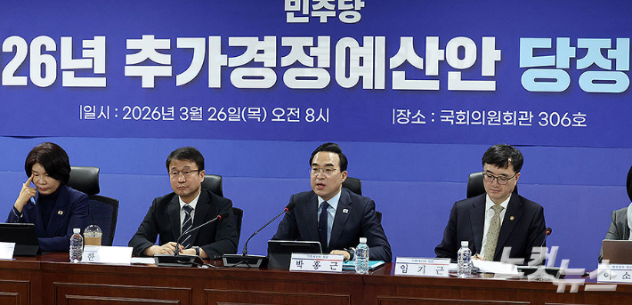 박홍근 기획예산처 장관이 26일 국회 의원회관에서 열린 2026년 추가경정예산안 당정협의에서 발언을 하고 있다. 정부와 더불어민주당은 중동 전쟁으로 인한 고유가 상황에 대응하기 위해, 석유 최고가격제로 인한 손실을 보전하고 나프타 등을 안정적으로 수급하는 등 25조원 규모의 추가경정예산안(추경)을 추진하기로 했다. 윤창원 기자