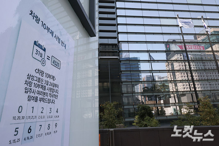 26일 서울 삼성생명보험 서초사옥 주차장 입구에 차량 10부제 시행 안내문이 붙어 있다. 정부의 에너지 절감 정책에 동참하기 위해 삼성, SK, LG, 롯데, 한화 등 주요 그룹들이 잇따라 차량 5·10부제를 실시하고 사내 절전 등 대응책 마련에 나섰다. 삼성그룹은 26일부터 운영 중인 모든 사업장에서 차량 10부제를 시행한다. 류영주 기자