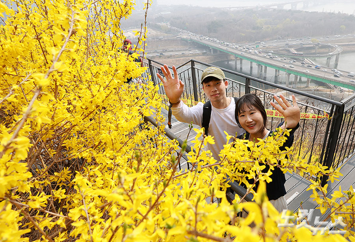 서울의 낮 기온이 21도까지 오르며 완연한 봄 날씨를 보이고 있는 가운데 27일 서울 성동구 응봉산 개나리 축제를 찾은 시민들이 봄을 즐기고 있다. 류영주 기자
