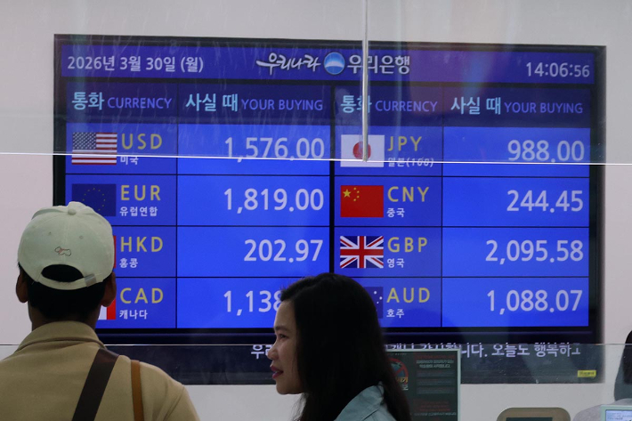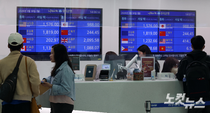이란 전쟁 확전 우려가 커지며 원·달러 환율이 전거래일보다 4.5원 오른 1513.4원에 출발하며 연 고점을 위협하고 있는 가운데 30일 인천국제공항 환전소에 원·달러 등 각국 환율이 표시되어 있다.