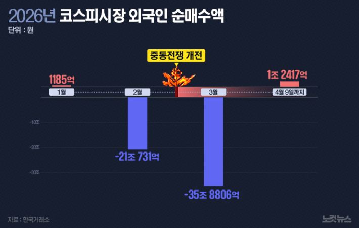 지난 3월 한 달 국내 유가증권시장에서 외국인 자금이 '역대 최대' 규모로 빠져나갔다. 이달 들어 일시 휴전 소식 등으로 매수세로 돌아서는가 싶더니, 크고 작은 총성이 이어지자 금세 빨간불이 켜졌다.