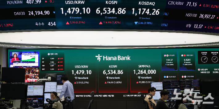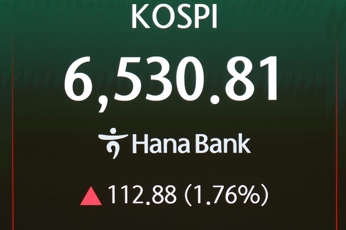 코스피가 장중 6500선을 넘은 23일 오전 서울 중구 하나은행 딜링룸 전광판에 코스피 지수가 표시되고 있다.