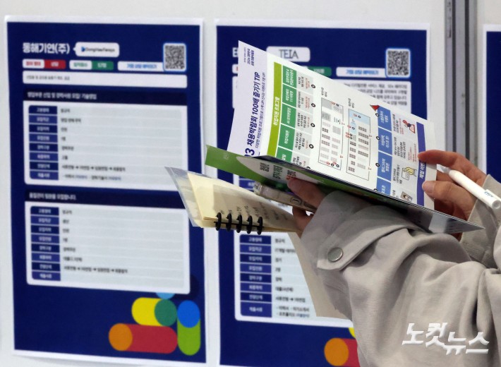 28일 서울 서초구 aT센터에서 열린 2026 대한민국 상생 채용박람회를 찾은 구직자들이 안내책자를 살펴보고 있다.