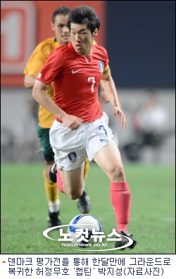 박지성은 15일(한국시간) 덴마크 에스비에르의 블루워터아레나 스타디움에서 끝난 덴마크와의 평가전(0-0 무승부)에 선발 출장해 후반 21분 염기훈(울산)과 교체될 때까지 66분간 그라운드를 누볐다. 지난달 14일 서울에서 열린 세네갈 평가전 이후 한달 만의 출격이었다.