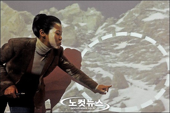 칸첸중가(8,586m) 정상 정복 논란을 빚은 여성 산악인 오은선(43.블랙야크)씨가 3일 오후 서울 금천구 가산동 블랙야크 본사에서 열린 ''2009 오은선 히말라야 등정보고회'' 기자회견에서 논란이 된 당시 상황을 설명하고 있다.