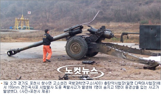 3일 오전 경기도 포천시 창수면 고소성리 국방과학연구소(ADD) 총탄약시험장(일명 다락대시험장)에서 견인곡사포 시험발사 도중 폭발사고가 발생해 1명이 숨지고 5명이 중경상을 입는 사고가 발생했다.