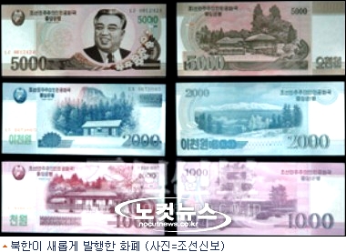 [BestNocut_R]새로 발행된 북한 지폐는 5,000원, 2,000원, 1,000원, 500원, 200원, 100원, 50원, 10원, 5원 9종류이고 주화는 1원, 50전, 10전, 5전, 1전 등 5종류이다.