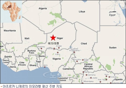 아프르카 니제르의 이모라렝 광산 주변 지도