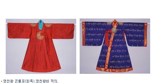 3. 곤룡포(袞龍袍) : 임금이 입던 정복으로 옷의 팔과 가슴에 용이 그려져 있는 도포임. 다홍색 바탕천에 금색의 반룡으로 수를 놓았는데 왕의 포에 표현된 용의 발톱은 5개임.
