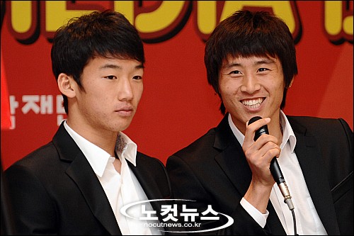 홍명보장학재단 주체 2009 자선축구 미디어데이가 21일 오후 상암동 서울월드컵경기장에서 열린 가운데 김민우 선수와 구자철 선수가 ''축구선수 아내들은 왜 미인일까요?''란 진행자의 익살스런 질문에 당황해하고 있다.
