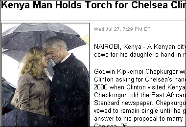 케냐의 한 남성이 빌 클린턴 前 미국 대통령의 외동딸인 첼시 클린턴과의 결혼을 꿈꾸며 5년째 ''일편단심'' 사랑을 보여주고 있다고 27일(현지시간) AP통신이 보도했다.