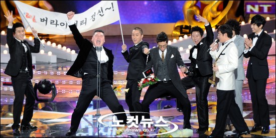 [BestNocut_R]26일 밤 서울 여의도 KBS 별관에서 ''2008 KBS 연예대상'' 시상식이 열린 가운데 대상을 수상한 강호동과 1박 2일 식구들이 ''버라이어티 정신''을 외치고 있다.