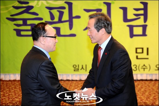 [BestNocut_R]13일 오후 서울 광화문 세종문화회관 세종홀에서 열린 ''국민행동본부의 애국투쟁기 : 법을 지키는 사람이 정의로운 사람이다'' 출판기념 및 후원행사에서 서정갑 국민행동본부장(왼쪽)과 한나라당 정몽준 대표가 악수를 나누고 있다.